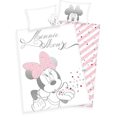 The ideal gift idea for any occasion: breathable toddler linen with reversible Minnie Mouse motif for fans of the world-famous Disney cartoon character Licensed 2-piece set: varied design thanks to reversible pillow case with detailed motif and reversible duvet cover with Minnie Mouse motif and striped back Quick and easy fitting: pillow case with flap opening, duvet cover with zipper High quality material: 100% cotton, produced according to Oeko Tex Standard 100, bright colours, easy to clean: washable at 60°C, tumble dry Contents: 1x Herding Bedding Set, Disney Minnie Mouse, 1x Pillow Case 40 x 60 cm + 1x Duvet Cover 100 x 135 cm, Colour: White/Multi-coloured