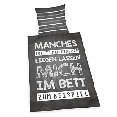 The ideal gift idea for every occasion: Breathable youth bed linen with humorous sayings Youthful 2-piece set: Varied design thanks to reversible pillowcase and reversible bed cover with funny sayings and striped back Quick and easy covering: Pillow and duvet cover with smooth-running zipper High quality material: 100% Cotton/Renforcé, Produced according to Oeko Tex Standard 100, Bright colours, Easy to clean: Washable at 60°C, Tumble dry Contents: 1 Herding Bedding Set, Sayings, 1 Pillow case 80 x 80 cm + 1 duvet cover 135 x 200 cm, Colour: Grey/white