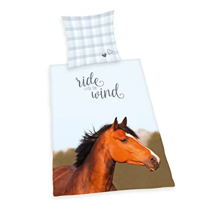 Herding Single Bedding Set, Horse Motif, Bed Cover, Pillowcase 80 x cm, Duvet Cover 135 200 With Button Placket, Cotton