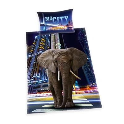 Herding YOUNG COLLECTION Bedding Set, Reversible Motif Big City Elephant, Duvet Cover 160 x 210 cm, Pillow Case 65 100 Cotton/Renforcé