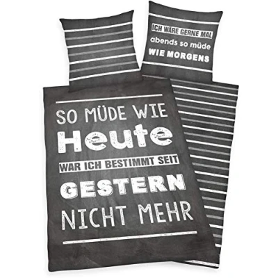 The ideal gift idea for any occasion: Breathable bed linen with funny quote Youthful 2-piece set: Varied design thanks to reversible pillow case and reversible duvet cover with funny quotes and striped back Quick and easy fitting: Pillow and duvet cover with smooth quality zipper High quality material: 100% Cotton/Renforcé, Produced according to Oeko Tex Standard 100, Bright colours, Easy to clean: Washable at 60°C, Tumble dry Contents: 1x Herding Bedding Set, Young Collection, 1x Pillow Case 80 x 80 cm + 1x Duvet Cover 135 x 200 cm, Colour: Grey/White
