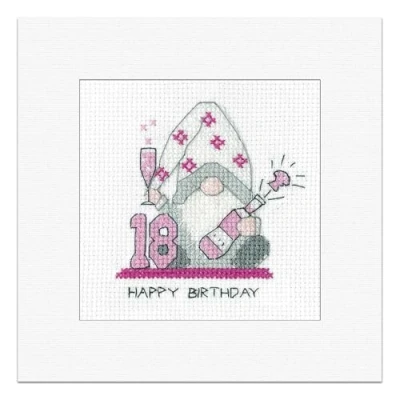 Gonk – 18th Birthday Card - Female - Counted cross stitch Greetings card kit by Kirsten Roche for Heritage Crafts Card measures 14cm x 14cm (5.5" x 5.5") - aperture size is 9.5cm x 9.5cm (3.75" x 3.75") stitched on 14 count aida and comes with white aperture cards and envelopes. Kit Contains : Zweigart 14ct Aida fabric, DMC stranded cottons, needle, clear charts and instructions, card and envelope. GO18F1802