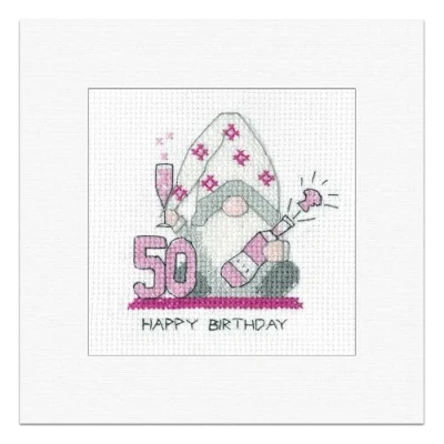 Gonk – 50th Birthday Card - Female - Counted cross stitch Greetings card kit by Kirsten Roche for Heritage Crafts Card measures 14cm x 14cm (5.5" x 5.5") - aperture size is 9.5cm x 9.5cm (3.75" x 3.75") stitched on 14 count aida and comes with white aperture cards and envelopes. Kit Contains : Zweigart 14ct Aida fabric, DMC stranded cottons, needle, clear charts and instructions, card and envelope. GO50F1810