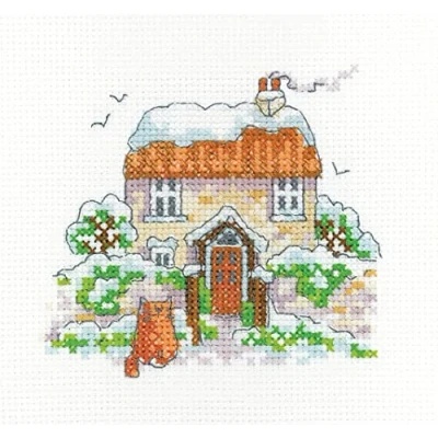 Winter Cottage - counted cross stitch kit from Heritage Crafts Part of the Heritage Crafts Simply Heritage range by Karen Carter Kits Contain : Zweigart 14 count Aida fabric, DMC stranded cottons sorted on to numbered cards, a needle, and clear charts and instructions Design size is 10 x 9cm (4” x 3.5”)