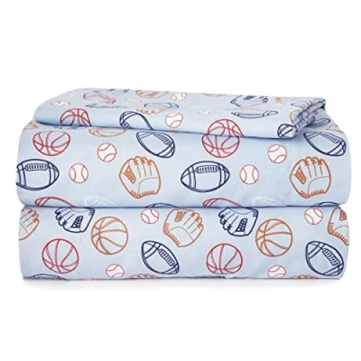 100% Polyester DESIGN: Printed Sport Icons are printed on this blue sheet set for a fun and colorful look. Sheets are perfect for added pop of color and design to any room. Perfect for kids, teens and young adults of all ages! ULTRA SOFT AND COZY: Super soft Polyester. High quality material. The polyester material is super soft for extra comfort and for a perfect nights sleep all year round. LONG LASTING DURABLE CONSTRUCTION: Crafted From Durable Microfiber. The Easy-Care Microfiber Is Machine Washable. Just Pop It In On Gentle Cycle With Cold Water And Air Dry Or Tumble Dry On Low. The Bright Colors Will Last Through Multiple Washes! WHAT'S INCLUDED: 4 Piece Set includes Fitted Sheet, Top/Flat Sheet, 2 Standard Pillow Cases. Fits standard Full sized beds.