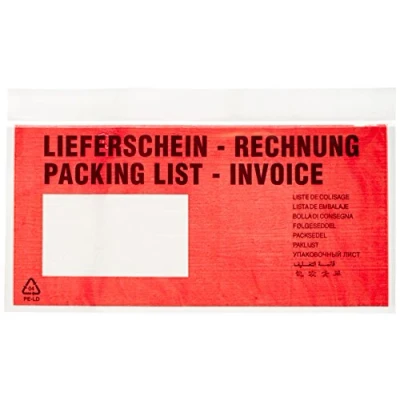 Packing List DIN long. PE film. With text “Packing List – Invoice / Lieferschein - Rechnung” [German language]. Self-adhesive Red/Clear. Pack of 1000.