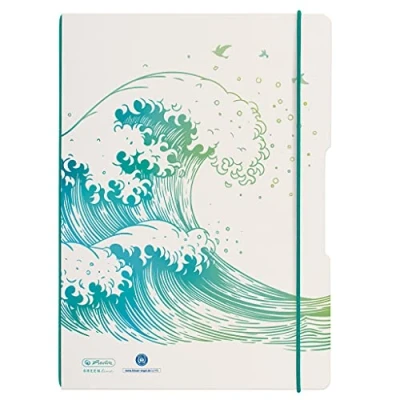 A4 notebook with white recycled paper, 80 g/m² 2 x 40 sheets with type 27 and 28 ruling (lined/squares with margin) and rounded corners. Exchangeable cover made from recycled material, with green elastic for closure. Design: GREENline Wave. 1 piece.