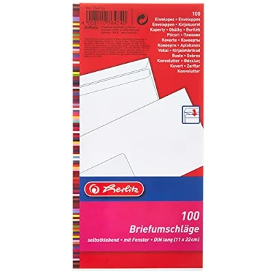 Herlitz DIN Long Format envelopes, Peel and Seal with Window, Pack of 100 Inner Print in Sealed foil Packaging, White Window dl