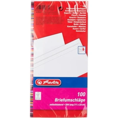 Herlitz DIN Long Format envelopes, Peel and Seal with Window, Pack of 100 Inner Print in Sealed foil Packaging, White Without Window dl