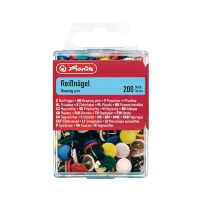Made of metal, plastic covered head, in plastic box Head diameter: 9.5 mm +/- 0.2 mm. Contents: 200 pieces in hanging box Colour: assorted colours. Similar to
