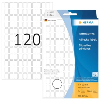 Self-adhesive multi-purpose labels made of high-quality writing paper Labelling and lettering - extremely easy, reliable and flexible Due to the "Free-to-move" coating HERMA Movables adhere reliably to all flat, dry, undamaged and dust-free surfaces Free Software on www.herma.co.uk/software: Print labels more simply than ever before – design them directly on the Internet, and print them at home or in the office. Labels per sheet: 120, Size: 8x12 mm, Material: Paper, matt, Colour: white, Number of Labels: 3840