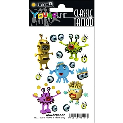 Self-adhesive children's tattoos made of film to be removed High-quality print with rich and bold colours Transfer film complies with EU cosmetics regulations Washable tattoo for a birthday, theme party or as a gift Box contents: 1 x Herma classic tattoo "monster" set - made in Germany