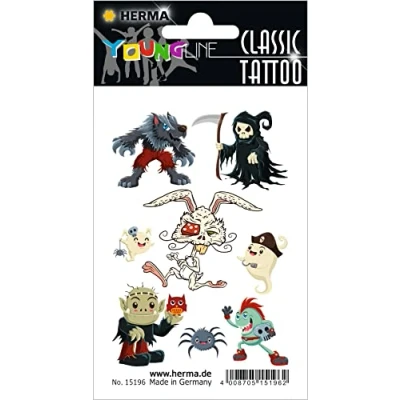 Self-adhesive children's tattoos made of film to be removed High-quality print with rich and bold colours Transfer film complies with EU cosmetics regulations Washable tattoo for a birthday, theme party or as a gift Box contents: 1 x Herma classic tattoo "zombies" set - made in Germany