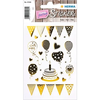 Stickers made of transparent foil in gold to peel and stick Filigree and shiny foil stickers with many beautiful and creative designs Ideal for kids, girls, boys, weddings, birthdays, party events For decorating, personalising, embellishing cards, invitations, letters, messages, photo albums, notebooks, gifts Box contents: 1 sheet of Herma creative stickers birthday party gold foil, 22 stickers