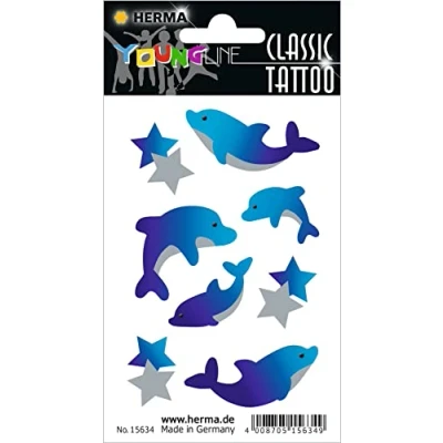 Skin-friendly transfer tattoos with creative motifs for young and old Colourful tattoo stickers give a distinctive style Ideal for fancy dress, carnival, Halloween, children's birthday party or theme party Decorative party tattoos for a shiny appearance at any festival Box contents: 8 x Herma adhesive tattoos made of film, made in Germany - dolphins