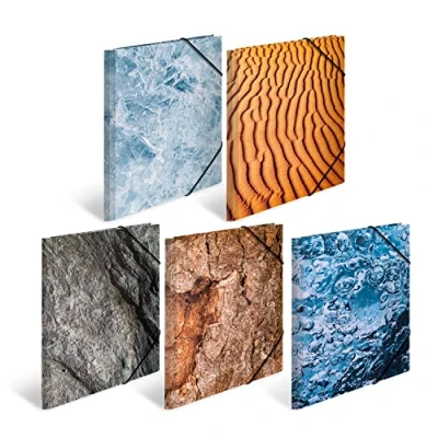 Printed elastic folder made of durable cardboard with natural motifs Corner tensioner in high-quality design for small and large drawings For optimal storage of documents, documents and files Perfect for school, university, office, nursery or in the home Box contents: 10 x HERMA drawing folders (length/width/height: 32 x 24 x 0.4 cm) - Ice (2x), sand (2x), stone (2x), water (2x), wood (2x)