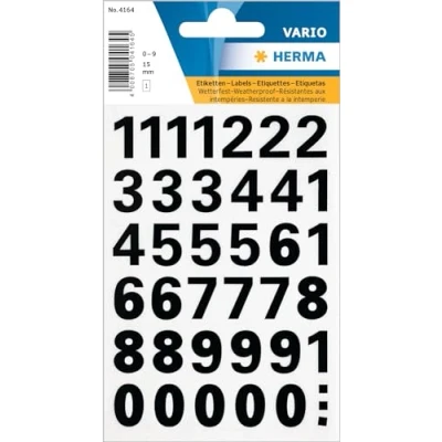 Small numbers stickers for individual labelling, markings or labellings. . Made of particularly high-quality materials, convince in rated Herma quality. . Weatherproof number stickers are suitable for both indoor and outdoor use. . Ideal for applications on bells, mailboxes, folders or storage boxes. RPA202023. 320233 Box contents: 39 x Herma number stickers, 15 mm, rectangular, black (1 sheet of 39 labels each)