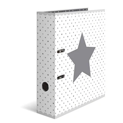 Printed ring binder in grey and white design (spine width 70 mm) Finger hole, wheel eyelets, lever mechanism and compressor bar made of solid metal For optimal storage of documents, documents and files Perfect for school, college, office, nursery or in the home Box contents: 10 x Herma motif folders (length / width / height: 28.5 x 7 x 31.5 cm) - white polka dots