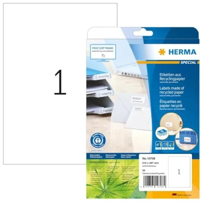 HERMA Self Adhesive Recycling Labels, 1 Label per A4 Sheet, 20 Sheets, 210 x 297 mm, 100% Recycled Paper Labels Stickers, Sticky for Laser & Inkjet Printer, Natural White