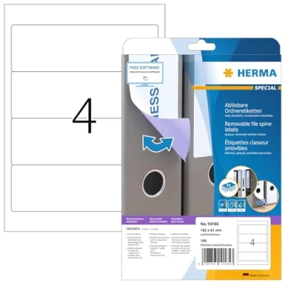 HERMA Self Adhesive Removable Spine Labels, 4 Labels per A4 Sheet, 25 Sheets, 192 x 61 mm, 100 Blank Lever Arch File Folder Stickers, Sticky for Laser & Inkjet Printer, White