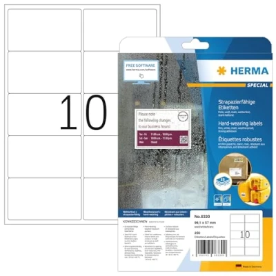 Durable film labels, UV- and age-resistant, waterproof, temperature-resistant from -30 to +80 °C All-round safety edge and optimal flatness protects printer drum and rollers from adhesive residue Environmentally friendly and sustainable: solvent-free adhesive and PVC-free Perfect for all laser printers, copiers and for writing by hand - not for inkjet printers Box contents: 8000 x Herma weatherproof shipping labels, DIN A4 format, 9.91 x 5.7 cm, rectangular, white (800 sheets of 10 labels)
