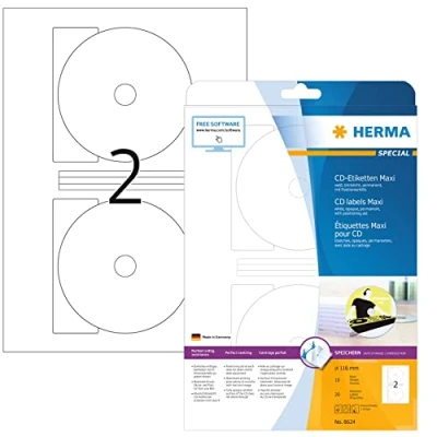 Cd labels Maxi A4, Ø 116 mm, White opaque, permanent adhesion 100% opaque: surface of the CD does not shine through Positioning aid on each label permits dead-centre placement, reliable adhesion, even in high-speed drives Suitable for inkjet printers, laser printers and copiers, perfect printing results in black-and-white or colour Design your labels professionally and for free with our Online software and practical templates. Visit herma /free-software