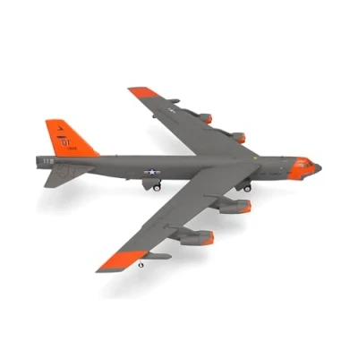 Herpa airplane model U.S. Air Force Boeing B 52H Stratofortress 49th Test and Evaluation Sqn "Test orange" livery on a scale of 1:200, metal miniature with pedastal, collectors edition