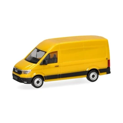 Herpa truck model MAN eTGE transporter high roof, broom yellow, on a scale of 1:87, plastic miniature, made in Germany, building, collectors edition