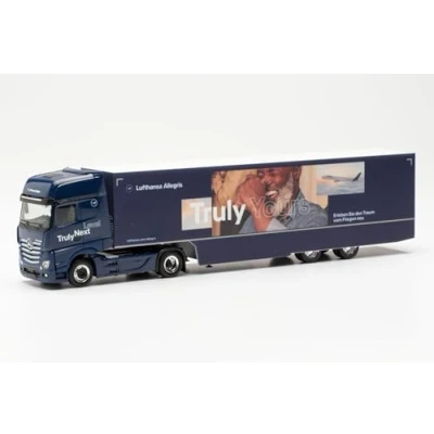 Herpa truck model Mercedes Benz Actros Gigaspace scaled down "Lufthansa" box semitrailer truck, on a scale of 1 : 87, plastic miniature, made in Germany, building, collectors edition