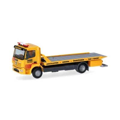Herpa truck model Mercedes Benz Atego 13 flatbed tow “Jäger, on a scale of 1:87, plastic miniature, made in Germany, collectors edition