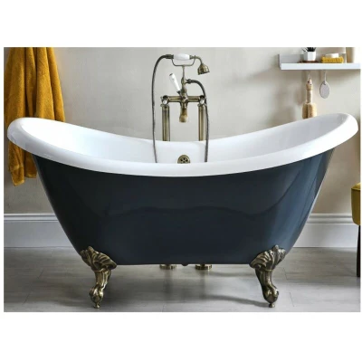 General description Accentuated by an eye-catching stone grey finish and brushed gold feet, the classic design of the Milano Hest double ended freestanding slipper bath will instantly enhance the style and elegance of your bathroom. Providing plenty of space and comfort to enjoy a luxurious bathing experience at either end, the bath is made from premium quality acrylic and features a hard-wearing coating that offers resistance to unsightly stains and scuffs. As the bath is not fitted with any tap-holes, it is the perfect choice for use with a freestanding or wall-mounted tap to complete the traditional aesthetic. Technical specifications Material: Premium quality 18mm thick acrylic Finish: Stone grey with hard-wearing coating Dimensions: 1750mm x 730mm x 770mm Capacity: 195 litres Feet: Brushed gold Compatibility and accessories Compatible with freestanding or wall-mounted taps Requires a freestanding or wall-mounted mixer tap Includes exposed bath waste and a shallow seal trap Other