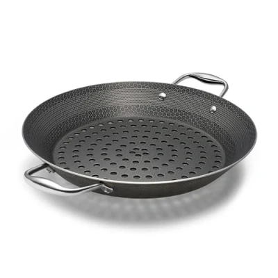 HexClad's hybrid tech utilizes tri-ply construction – aluminium between two layers of stainless-steel - laser-etched with our hexagonal nonstick surface to deliver the searing power of stainless, durability of cast-iron and easy cleanup of nonstick. Our Hybrid BBQ Pan gives a beautiful sear to delicate ingredients like veggies without risk of falling through the grates; The perforations allow flavorful smoke to permeate food while the high, angled sides let you stir, flip and arrange with ease! Tri-ply construction with an aluminum core for quicker even heating, it’s safe to use on any home cooktop or stovetop, including induction. HexClad is metal utensil-safe, dishwasher-friendly, and oven-safe up to 900°F. (Tempered glass lids are oven-safe up to 400°F, while stainless steel lids are oven-safe up to 900°F.) HexClad products that are sold by HexClad Cookware are backed by a lifetime warranty from manufacturer's defects. (Commercial and restaurant use excluded). Your purchase includes one HexClad BBQ Grill Pan; The HexClad BBQ Grill Pan measures approximately 13 inches in diameter, 4 inches in height, and 3 lbs in weight., Weight: 3.0 Pounds, Manufacturer: HexClad
