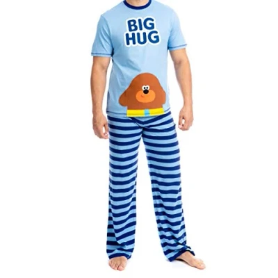 Adults Hey Duggee Pyjamas Adorable PJs with an embroided print of Duggee and the slogan "Big Hug" Elasticated waist for extra comfort Perfect when paired with the matching 'Little Hug' Kids Pyjamas Officially licensed Hey Duggee Merchandise, exclusively for Character UK
