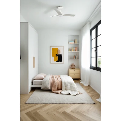 Net LightingHEY S is a ceiling fan with light designed by Faro Lab with an ultra-compact DC motor ideal for rooms smaller than 13 m². The white wooden blades of this ceiling fan with light wrap around the motor for an ultra-light effect. Operated by remote control, included. This white fan has 6 adjustable speeds, reverse function and is suitable for sloping ceilings.
