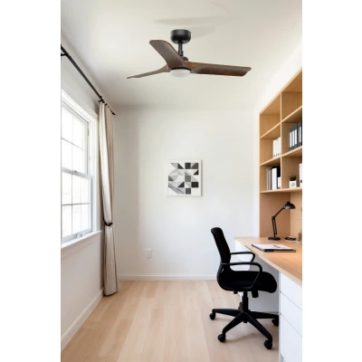 Net LightingHEYWOOD S LED is a ceiling fan with light designed by Faro Lab with an ultra-compact DC motor for rooms smaller than 13 m². The dark wood blades of this ceiling fan wrap around the motor for an ultra-light effect. Operated by remote control, included. This black fan has 6 adjustable speeds, reverse function and is suitable for sloping ceilings.
