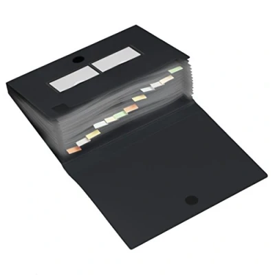 With 12 tabs and coloured tab strips, twin card holders and spine label. Velcro closure. Size 245x330x40mm Made from durable Polypropylene. Color: Black