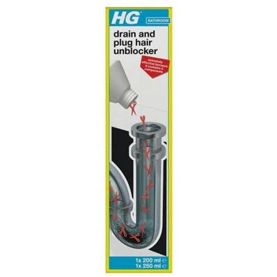 JoybuyThe HG Bathroom Drain and Plug Hair Unblocker is a ready-to-use formula containing potassium hydroxide to dissolve hair, grease, and soap build-up in drains. Its two-component system effectively clears blockages in shower drains and sinks without damaging pipes.