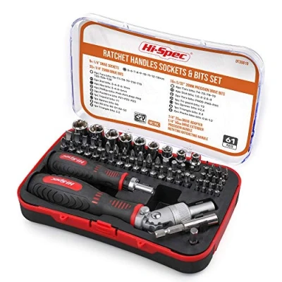 Hi Spec 61pc 1/4 Hex Driver Bits & Socket Set with Right Angle Ratchet Handle. Easy Repairs Torx Small Precision Multi Bits. Screwdriver Bit in a Storage Case