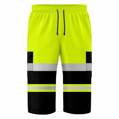 Hi Viz 3/4 Cargo High Visibility Safety Work Wear 2 Tone Black Contrast Drawstring Multi Pockets Reflective Tape Fleece Shorts S/2XL