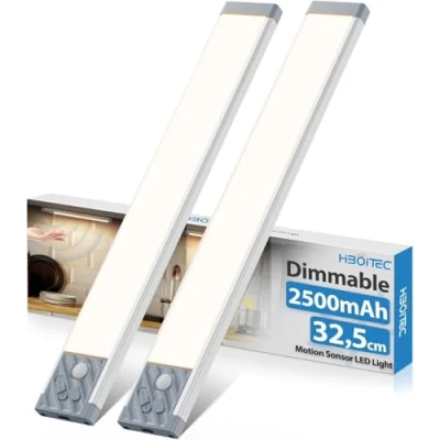 【2500mAh Long Lasting & USB-C Rechargeable Light】 Equipped with a powerful 2500mAh rechargeable battery, our battery operated lights provide extended usage without frequent recharging. In always-on mode, under cabinet kitchen lights can last up to 7 hours, and in motion sensor mode, cupboard lights can last 7-60 days on a single full charge (depending on usage frequency). Recharges fully in just 3-4 hours via the included USB-C cable. 【70LED Ultra bright & Dimmable Wardrobe Lights】Each under counter light is equipped with 70 high-brightness LEDs, Warm White Light, reaching a maximum brightness of 350 lumens (7x brighter than an iPhone flashlight). Our kitchen lights provide powerful lighting with adjustable brightness levels and ensure optimal illumination of dark corners in the kitchen, Dimmable cabinet lights motion sensor reduce the risk of tripping at night and provide safety for the elderly and children. 【32.5CM Sensitive Motion Sensor Lights Indoor】HIBOITEC under cupboard kitchen lights feature versatile operating modes. In motion sensor mode, the cabinet lights activate only in darkness/low light, automatically turning on when motion is detected within 5 meters at a 120° angle, and turn off after 20 seconds of no motion. No longer worry about tripping in the dark. The always-on mode provides continuous lighting for daily use, such as reading or camping. 【Magnetic, Hanging & Adhesive Design Kitchen Lights】 The Wardrobe Lights motion sensor feature a strong magnetic back AND included strong adhesive tape, enabling installation in just 3 seconds - no drilling, no wiring, no tools. These under cupboard lights can be securely attached to any metal surface or other flat surfaces. Plus! Our under shelf lighting have a hidden hook that other battery lights don't have. Flexibly movable and reusable for cabinets, shelves, worktops, wardrobes, or closets. 【Perfect Multi-Room Gift & Lifetime Guarantee】 Exquisite packaging makes these a great gift choice, perfect for your wife, husband, or mother. Ideal for kitchens, bathrooms (charge outside humid areas), wardrobes, closets, hallways, and more. With a lifetime guarantee, they offer unmatched quality, durability, and value for money. Transform your space with effortless, versatile light!