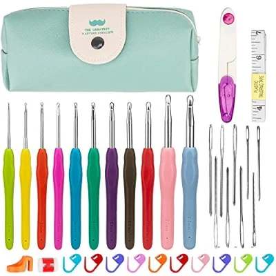 Comprehensive Crochet Hook Set - This crochet set includes 11 hooks in the following sizes: 2.0mm, 2.5mm, 3.0mm, 3.5mm, 4.0mm, 4.5mm, 5.0mm, 5.5mm, 6.0mm, 6.5mm, and 7.0mm. Each hook is clearly engraved with its size on the handle for easy identification. With a total length of 14.2 cm and a handle length of 10 cm, these hooks provide comfort and precision, making them ideal for beginners and experienced crocheters alike. Durable Materials and Comfortable Design - The hooks are made from sturdy aluminum, while the soft TPR (Thermoplastic Rubber) handles offer a comfortable, non-slip grip. The ergonomic design reduces hand fatigue during extended use, allowing you to crochet for hours without discomfort. Complete Set of Tools - In addition to the 11 crochet hooks, the kit includes essential tools: a row counter to track your progress, a 150 cm tape measure for precise measurements, a ring cutter and scissors for yarn cutting, a needles tube, 9 yarn needles, 10 stitch markers, and a convenient storage bag to keep everything organized. Perfect for Beginners - This crochet kit is designed specifically for beginners, providing all the tools needed to start crocheting right away. The colorful rubber handles help differentiate between hook sizes, and the set includes everything from small to large hooks, making it easy to experiment with different projects and yarns. Portable and Convenient Storage - All tools are neatly stored in the included storage bag, making this crochet set perfect for on-the-go crafting. Whether you’re crocheting at home or traveling, you’ll always have your essentials organized and within reach.
