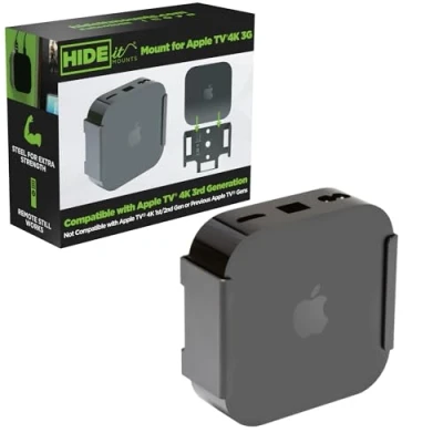 MADE FOR APPLE TV 4K 3RD GEN. Unlike other wall mounts, this HIDEit Mount is custom designed to fit the new 2022 Apple TV 4K 3rd Generation. This mount does not fit other models such as the Apple TV 4K 1st + 2nd Gens, Apple TV HD, Apple TV 3 or Apple TV 2. STEEL FOR ULTIMATE STRENGTH. Our Apple TV holder for back of tv is made from 16-gauge, cold-rolled steel for strength you can trust. Powder-coat finish won’t rust or chip and blends seamlessly with your Apple TV 4K 3rd Generation. WALL OR VESA MOUNT. The HIDEit Apple TV bracket makes it easy to wall or VESA mount your Apple TV 4K 3rd Gen for a sleek home media setup! Added VESA holes allow you to mount your 3rd Generation Apple TV 4K directly to the back of your TV! REMOTE STILL WORKS. No need to worry about signal interference, the Apple TV remote uses Bluetooth technology, so you can HIDE your Apple TV behind the TV with confidence. INSTALLit IN JUST 3 EASY STEPS. No complicated templates. Drill not required. Stud mounting optional. Includes one Apple TV Mount and all necessary mounting hardware.