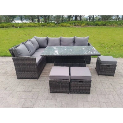 High Back Corner Rattan Garden Furniture Sofa Rising Dining Table Height Adjustable 9 Seater 3 Small Foot Stools Fimous