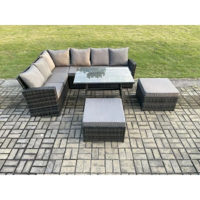High Back Outdoor Garden Furniture Set Rattan Corner Sofa Dining Table With 2 Big Footstool 8 Seater Dark Grey Mixed Fimous