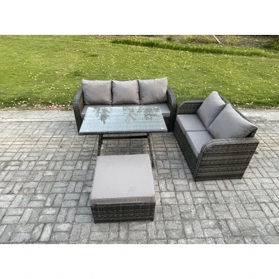 General description This PE rattan outdoor furniture set is an excellent addition to your patio or garden. It is constructed from high-quality PE rattan and durable galvanized steel, ensuring sturdiness and longevity. This garden furniture set can be left outdoors all year round. Technical specifications 3 Seater Sofa: 177W x 67D x 79H cm Rectangular Dining Table: 110L x 70W x 70H cm Big Footstool: 65L x 65W x 34H cm Love Sofa: 124W x 67D x 79H cm Seat Cushion Thickness: 8 cm Material: Dark grey mixed rattan with dark grey fabric Glass Thickness: 5 mm tempered glass Installation Items come flat packed and are easy to assemble. The furniture features sturdy galvanized steel tube frames with powder coating to prevent rust. Usage Low maintenance is required, with removable cushion covers for easy cleaning. It is recommended to keep the cushions indoors or use a rain cover when not in use. To prolong the life of the furniture, use a rain cover if not in use for an extended period. Other