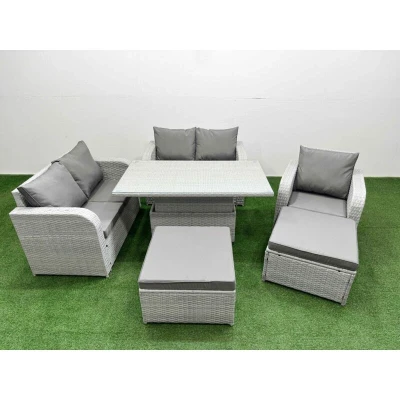 General description This deluxe PE rattan sofa set is an excellent addition to your patio or garden, crafted from high-quality PE rattan and durable galvanized steel. The set includes a reclining chair, loveseat sofa, adjustable lifting dining or coffee table, and two big stools, all designed for both indoor and outdoor use. Technical specifications Reclining chair dimensions: 74W x 69D x 79H cm Loveseat sofa dimensions: 124W x 67D x 79H cm Big footstool dimensions: 65L x 65W x 34H cm Lifting table dimensions: 140L x 80W x 68/48H cm (height adjustable from 68 cm to 48 cm) Sofa weight capacity: 250 kg Table weight capacity: 80 kg Color: Light grey rattan with dark grey fabric Installation Items come flat packed and are easy to assemble. Includes sturdy galvanized steel tube metal frames with powder coating to prevent rust. Usage The two armchairs are adjustable, allowing you to change the backrest inclination from 90° to 130° using a button. Low maintenance with removable cushion