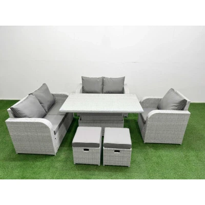 General description This deluxe PE rattan sofa set is a great addition to your patio or garden, made of high-quality PE rattan and durable galvanized steel. The set includes reclining chairs, a loveseat sofa, stools, and a lifting table, providing both comfort and style for indoor or outdoor use. Technical specifications Reclining chair dimensions: 74W x 69D x 79H cm Loveseat sofa dimensions: 124W x 67D x 79H cm Stool dimensions: 40W x 40D x 34H cm Lifting table dimensions: 140L x 80W x 68/48H cm (height adjustable from 68 cm to 48 cm) Sofa weight capacity: 250 kg Table weight capacity: 80 kg Color: Light grey rattan with dark grey fabric Installation Items come flat packed and are easy to assemble. Sturdy galvanized steel tube metal frames with powder coating to prevent rust. Usage Adjustable reclining chairs with an inclination range of 90°-130°. Low maintenance with removable cushion covers. Recommended to keep cushions indoors or use a rain cover when not in use. Other information