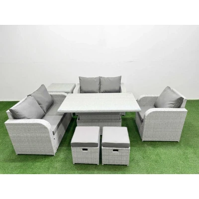 General description This deluxe PE rattan sofa set is a great addition to your patio or garden, made of high-quality PE rattan and durable galvanized steel. The set includes adjustable reclining chairs and a lifting dining or coffee table, making it versatile for indoor and outdoor use. Technical specifications Reclining chair dimensions: 74W x 69D x 79H cm Love sofa dimensions: 124W x 67D x 79H cm Stool dimensions: 40W x 40D x 34H cm (2 stools included) Side table dimensions: 65L x 65W x 66H cm Lifting table dimensions: 140L x 80W x 68/48H cm (height adjustable) Sofa weight capacity: 250 kg Table weight capacity: 80 kg Color: Light grey rattan with dark grey fabric Installation Items come flat packed and are easy to assemble. Usage Adjust the inclination of the chair back from 90° to 130° using the button. Low maintenance with removable cushion covers. Keep cushions indoors or use a rain cover when not in use. Cover the furniture with a rain cover if not used for a long time. Other