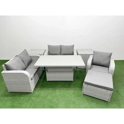 General description This deluxe PE rattan sofa set is an excellent addition to your patio or garden, crafted from high-quality PE rattan and durable galvanized steel. The set includes adjustable reclining chairs, a loveseat sofa, a big footstool, a lifting dining or coffee table, and two side tables, all designed for both indoor and outdoor use. Technical specifications Reclining chair dimensions: 74W x 69D x 79H cm Loveseat sofa dimensions: 124W x 67D x 79H cm Big footstool dimensions: 65L x 65W x 34H cm Side table dimensions: 65L x 65W x 66H cm Lifting table dimensions: 140L x 80W x 68/48H cm (height adjustable between 68 cm and 48 cm) Sofa weight capacity: 250 kg Table weight capacity: 80 kg Color: Light grey rattan with dark grey fabric Installation Items come flat packed and are easy to assemble. Usage Low maintenance with removable cushion covers. Recommended to keep cushions indoors or use a rain cover when not in use. Use a rain cover for the furniture if not in use for an