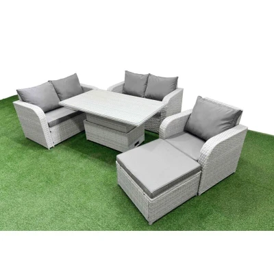 General description This deluxe PE rattan sofa set is a great addition to your patio or garden, made of high-quality PE rattan and durable galvanized steel. The set includes adjustable reclining chairs, a loveseat sofa, a big footstool, and a lifting table, all designed for comfort and style. Technical specifications Reclining chair dimensions: 74W x 69D x 79H cm Loveseat dimensions: 124W x 67D x 79H cm Big footstool dimensions: 65L x 65W x 34H cm Lifting table dimensions: 140L x 80W x 68/48H cm (height adjustable) Sofa weight capacity: 250 kg Table weight capacity: 80 kg Seat cushion thickness: 8 cm Glass thickness: 5 mm tempered glass Installation Items come flat packed and are easy to assemble. The set features sturdy galvanized steel tube metal frames with powder coating to prevent rust. Usage The two armchairs are adjustable, allowing you to change the backrest inclination from 90° to 130° using a button. The removable cushion covers make maintenance easy, and it is recommended